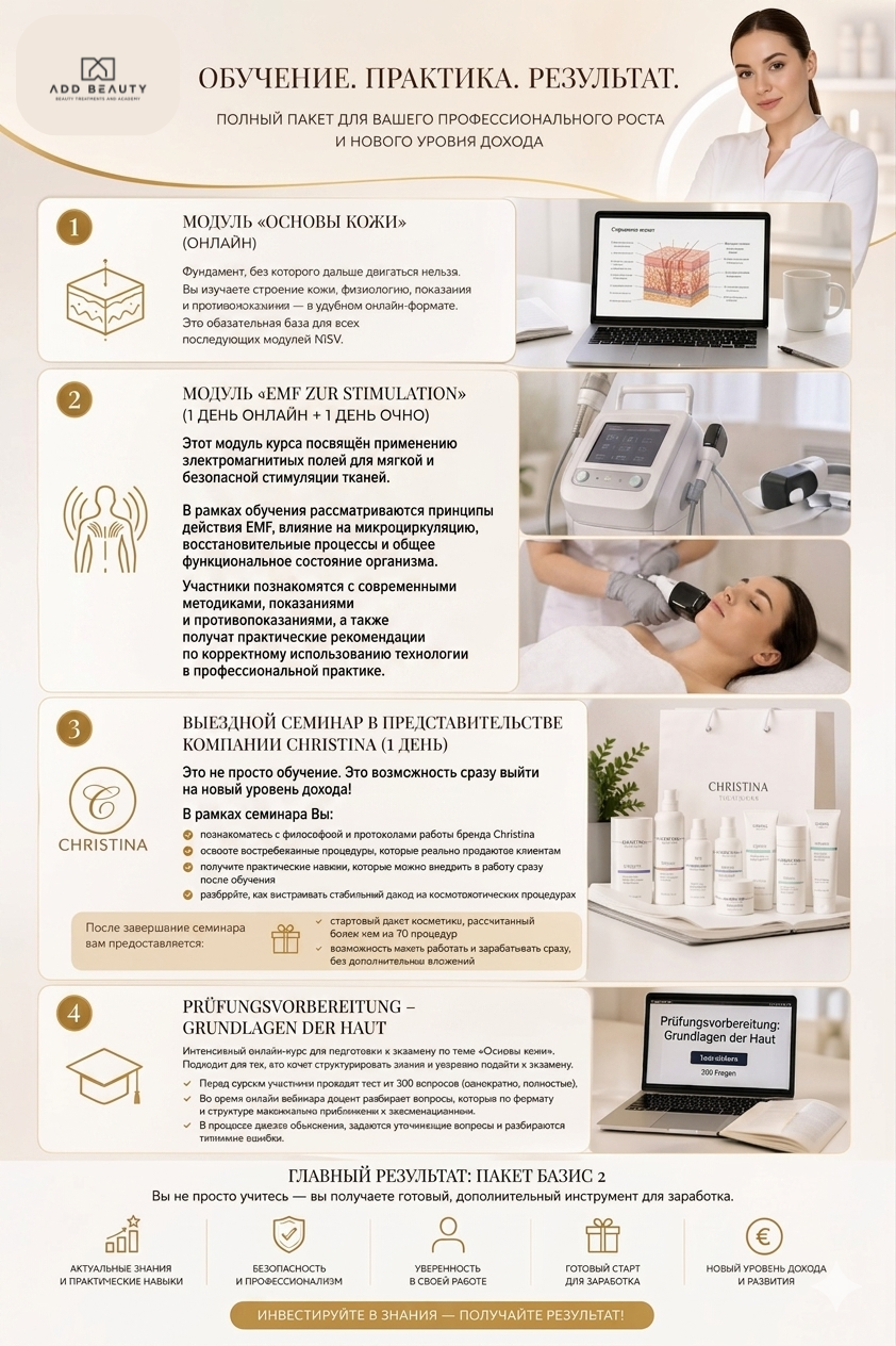 Вы изучаете строение кожи, физиологию, показания и противопоказания — в удобном онлайн-формате. Это обязательная база для всех последующих модулей NiSV.